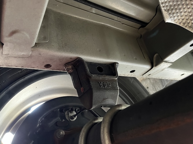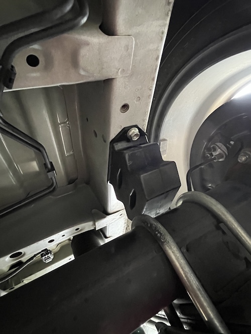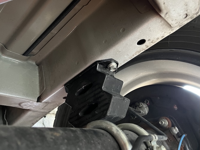 反対側も同じ作業 リーフスプリング固定の2本のUボルト間にラバーが来るように調整しながら固定した。手が入れにくいわけでもなく作業難易度は低いが、作業環境は車体下で狭い。
